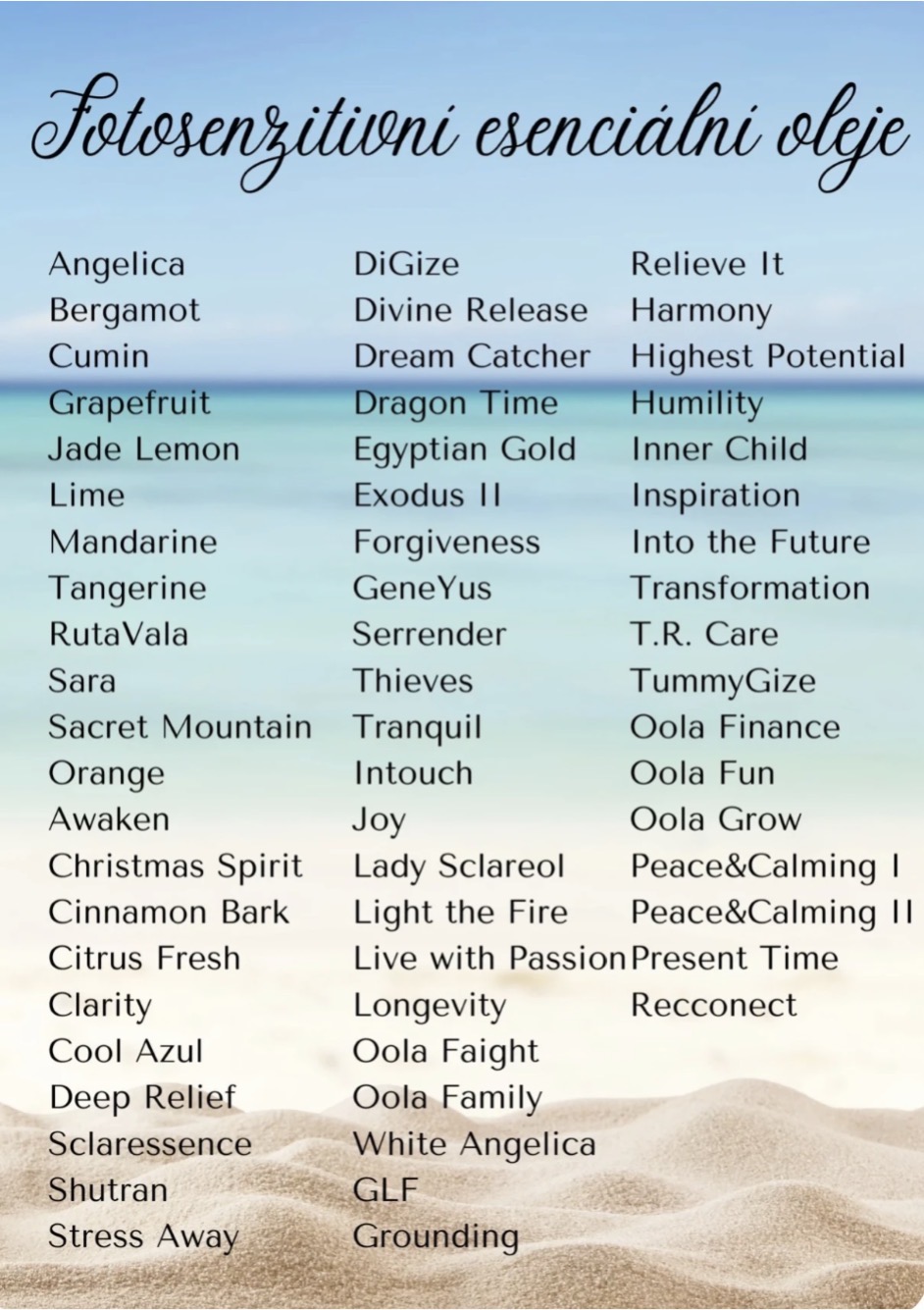 Známé svou svěžestí a také výraznou barvou, jsou to převážně citrusové oleje. Citron, Limetka, Grapefruit, Pomeranč, Stress Away, Klid a zklidnění, Citrusová svěžest..... to jsou některé příklady fotosenzitivních olejů. U většiny olejů citlivých na slunce platí časový horizont 12 hodin, někdy 48 hodin po aplikaci. Čím větší množství oleje je aplikováno, tím delší je i pravděpodobnost fotosenzitivy. Čtěte štítky na lahvičkách. Fotosenzitivní oleje mají po rozevření štítku napsané, že nesmí po aplikaci přijít 12 hodin do styku se sluncem.