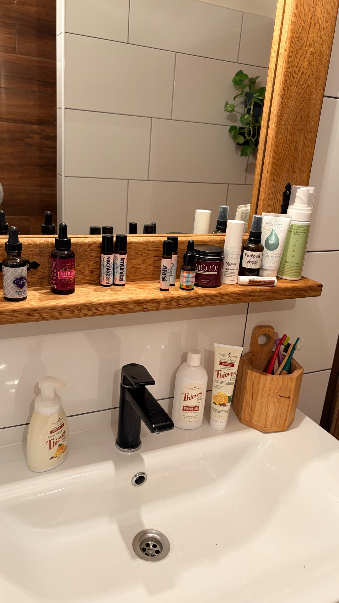 Má koupelna prošla kompletní transformací. Místo poliček plných plastových obalů s chemickými produkty nyní najdete elegantní hnědé lahvičky s domácími přípravky, které: