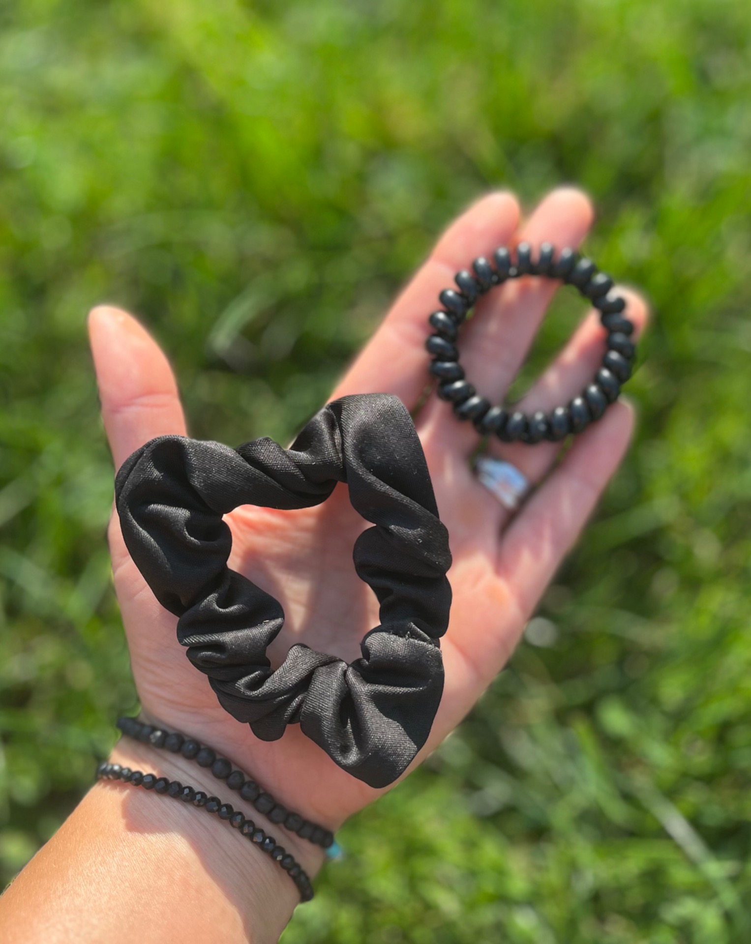 - Gumičky: Pro šetrnou péči o vlasy je ideální používat gumičky bez kovových spojek. Například textilní, spirálové nebo látkové gumičky. Ty minimalizují třepení konečků, lámání vlasů a celkově šetří vlasovou strukturu. Vyhýbat byste se měli klasickým gumičkám s kovovým kroužkem, které mohou vlasy poškodit.