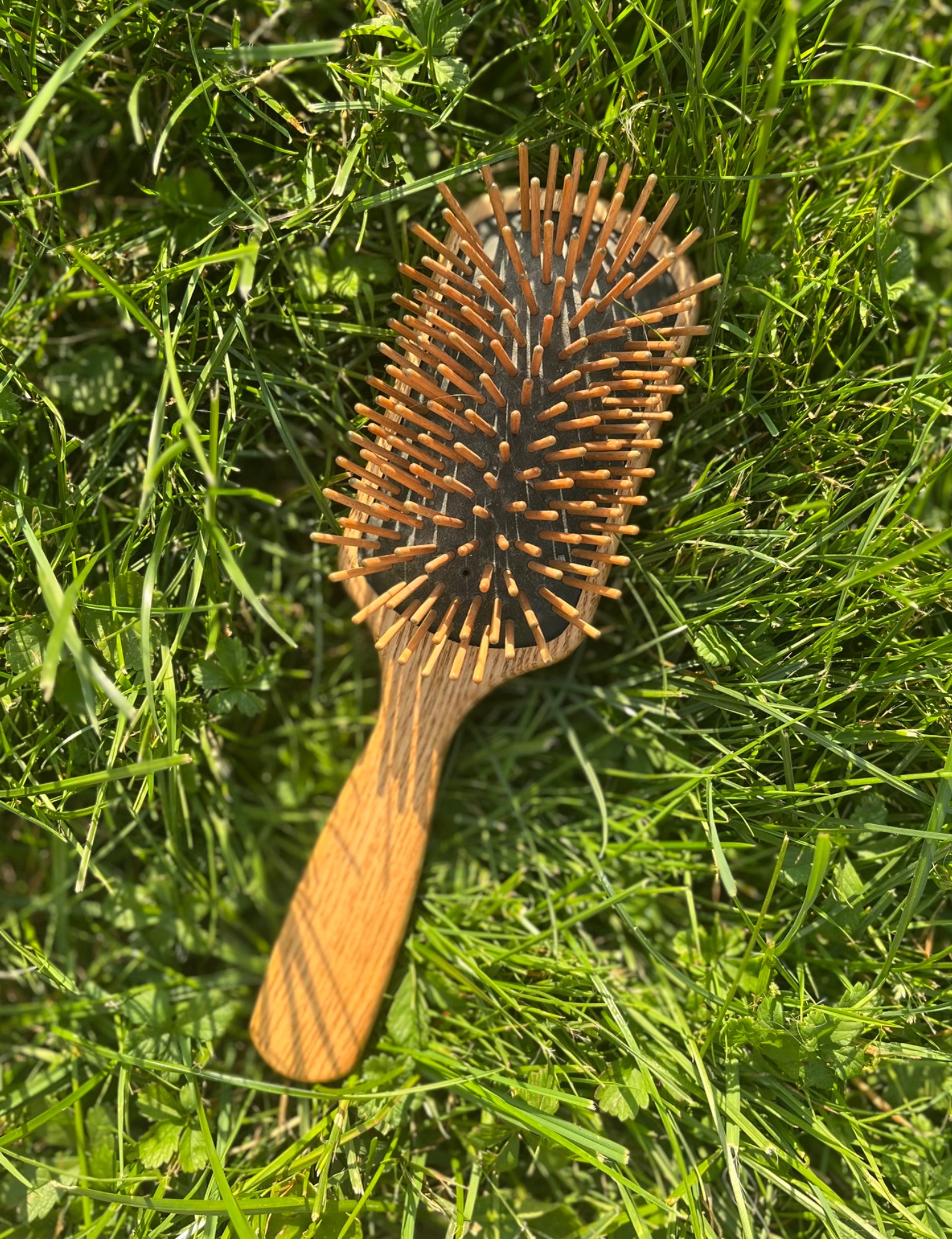 - Kartáče: Používám dřevěnou nebo bambusovou kefku. Na rozdíl od plastu netvoří statickou elektřinu, nepoškozuje vlas a pomáhá rovnoměrně roznášet přirozený maz po celé délce.