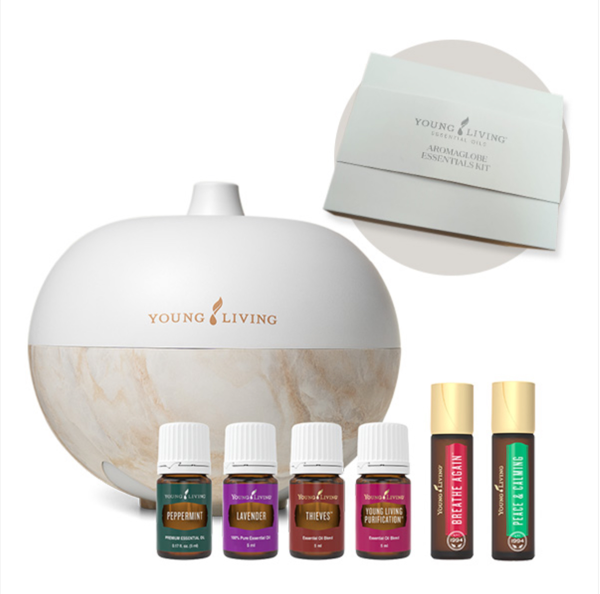 Difuzér AromaGlobe, Peace & Calming Roll-On 10 ml, Breathe Again Roll-On 10 ml, EO Lavender 5 ml, Peppermint 5 ml, Thieves 5 ml, Purification 5 ml