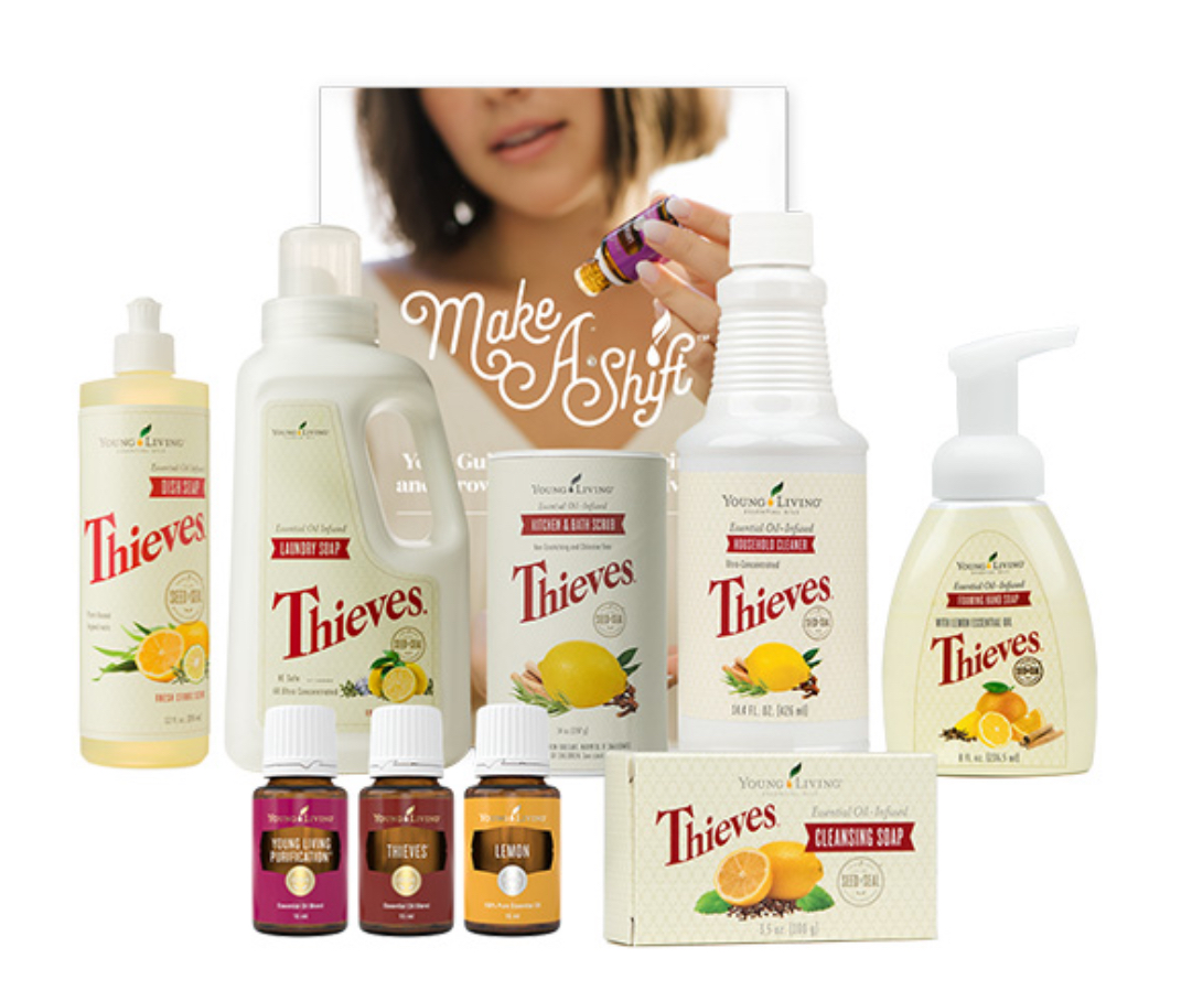 - Tato sada obsahuje řadu Thieves®, kterou tvoří jemné a účinné alternativy ke všemu potřebnému pro váš domov a úklid. Přivítejte přírodní životní styl a proměňte svůj domov ve voňavé, šťastné útočiště bez škodlivých chemikálií. V této sadě najdete vše od prostředku na nádobí po prací prostředek společně s komplexní brožurou o úklidu, která zahrnuje nejrůznější tipy. Je perfektní pro ty, kteří mají zájem o smysluplný přechod k přírodnímu životu.