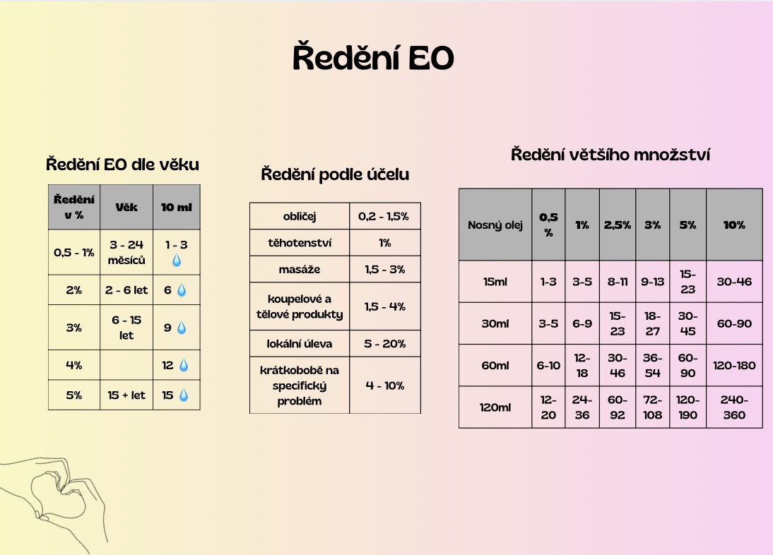 Ať už si chystáš roll-on, masážní směs nebo péči o pleť, s touhle tabulkou máš jistotu, že pracuješ bezpečně a efektivně. Pokud budeš tápat v konkrétní situaci, klidně se ozvi – dám ti přesné ředění podle věku, typu oleje i cíle.